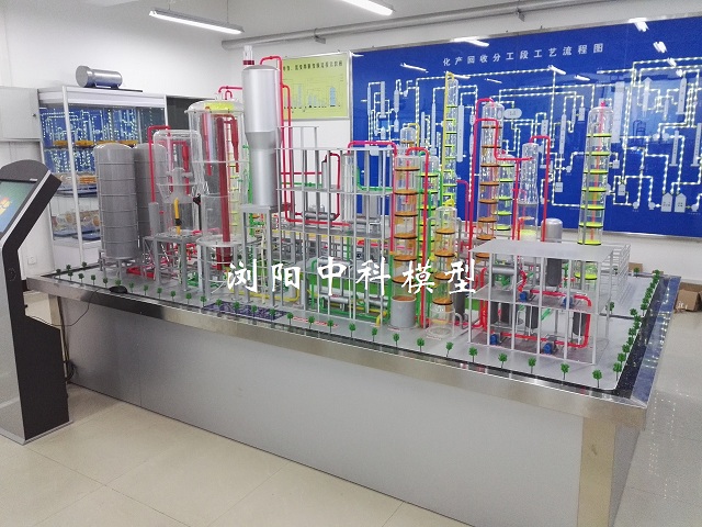 180萬噸/年甲醇制烯烴裝置模型按實(shí)際工廠工段流程圖布置,展示生產(chǎn)線車間設(shè)備及管道工藝,按生產(chǎn)工段工藝進(jìn)行排布,主要設(shè)備結(jié)構(gòu)透明,物料管道采用分色LED燈光演示生產(chǎn)過程;甲醇制烯烴實(shí)訓(xùn)裝置由甲醇轉(zhuǎn)化烯烴單元(進(jìn)料汽化急冷、反應(yīng)再生、蒸汽發(fā)生、燃燒空氣和廢氣工序),烯分離回收單元(壓縮、二甲醚回收、水洗、堿洗、干燥、乙炔變換、分餾、丙烯冷卻、氧化物回收工序)等工段設(shè)備及及各類泵閥、管廊系統(tǒng)組成。